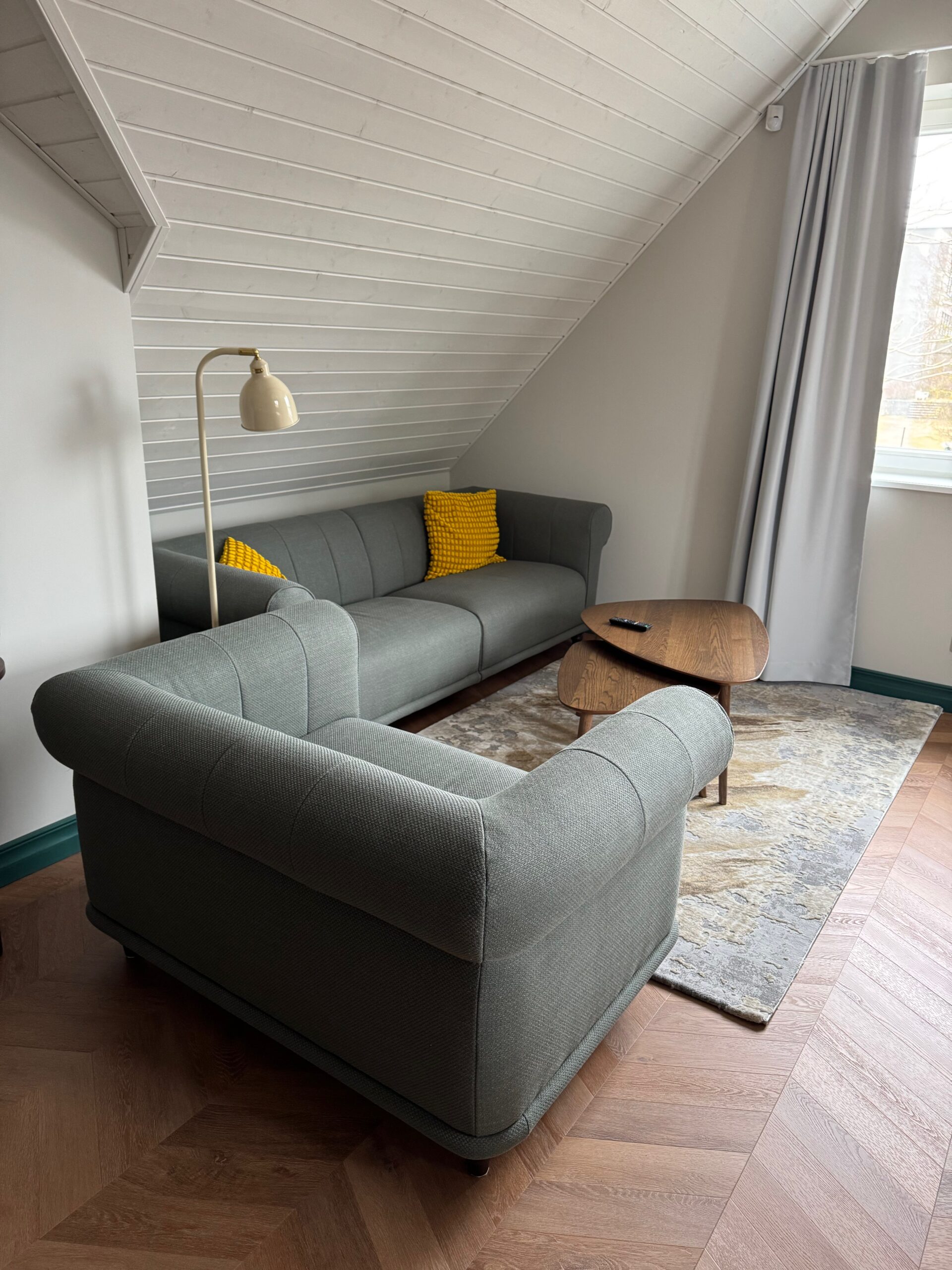 Teise korruse korteris on kaks magamistuba, millest üks on kaheinimesevoodiga ja teine kahe eraldi paikneva voodiga, avatud planeeringuga köök-elutuba ning tualett-pesuruum.